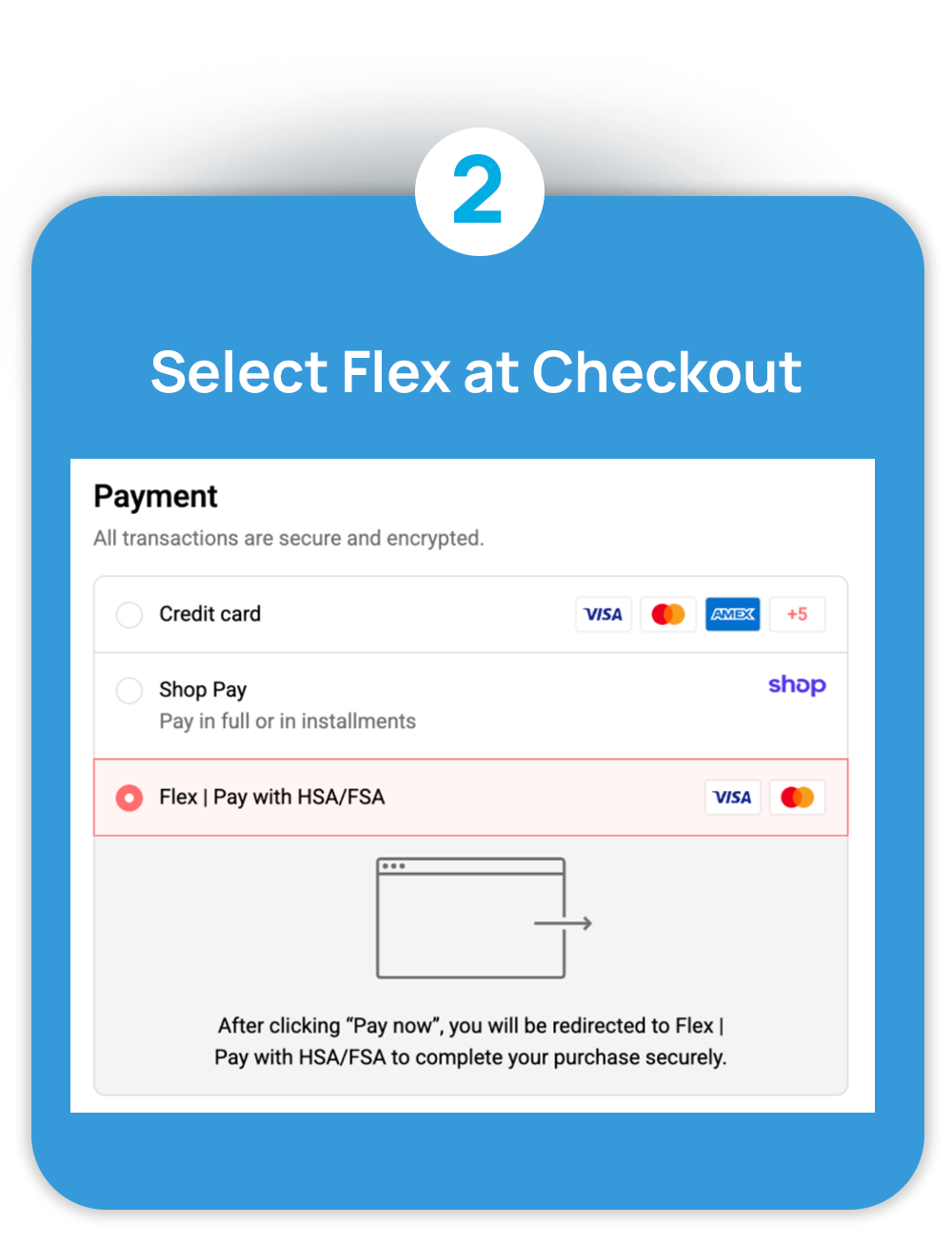 To use your HSA or FSA debit card, add eligible products to your cart as usual. At checkout, select “Flex | Pay with HSA/FSA” as your payment option, enter your HSA or FSA debit card, and complete your checkout as usual. If you don’t see “Flex | Pay with HSA/FSA,” you may be in Shop Pay. Select “checkout as guest” to view more payment options.