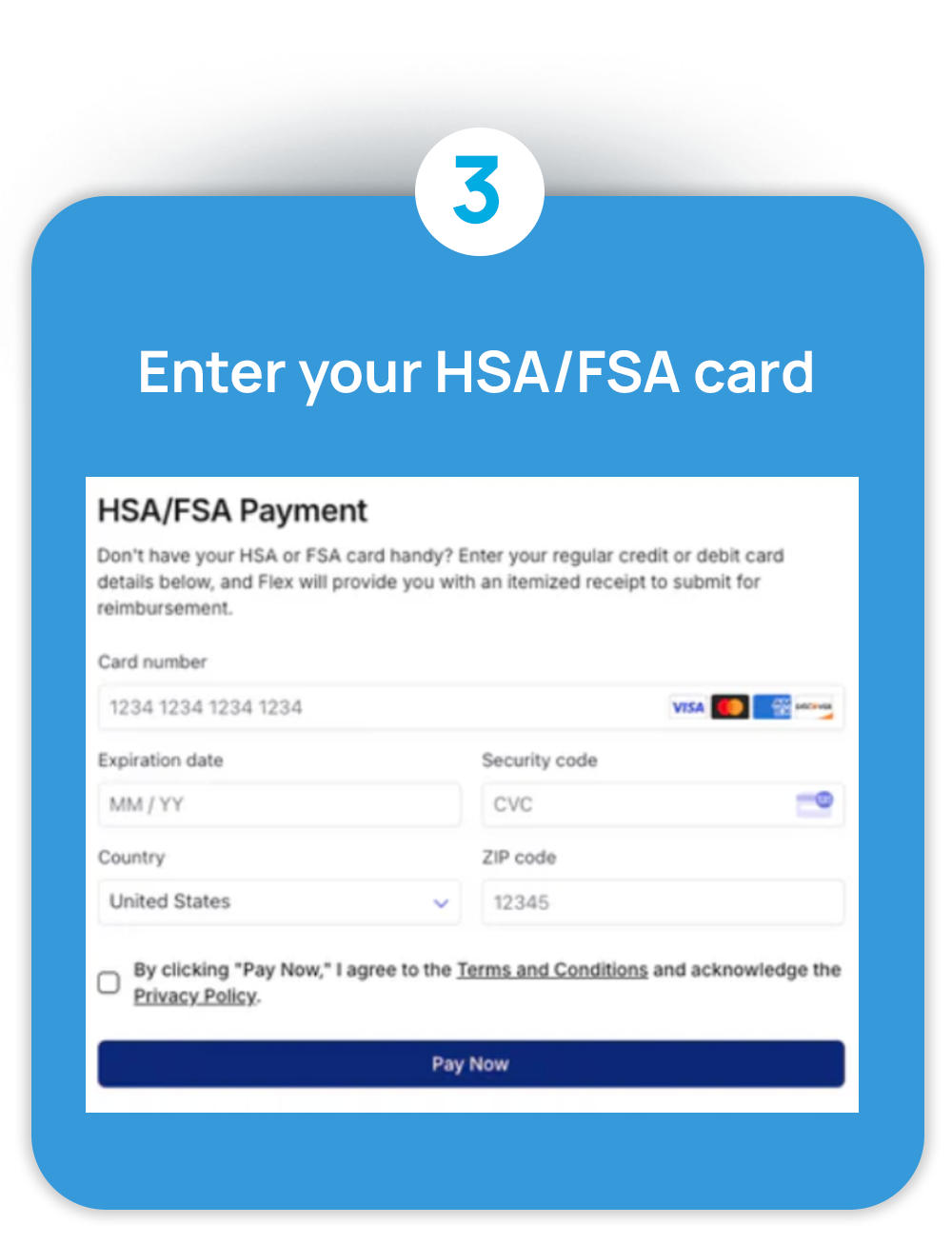 If you don’t have your HSA or FSA card handy, still select “Flex | Pay with HSA/FSA” as your payment method. Enter your credit card information and Flex will email you an itemized receipt to submit for reimbursement.